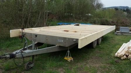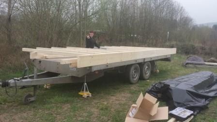 Samstag erst mal zum Holzhandel und Siebdruckplatten geholt. Dann die Bodenplatte umgedreht, mit 4 Leuten ging das, Siebdruck zugesägt und verschraubt. Anschließend die Bodengruppe über Kreuz