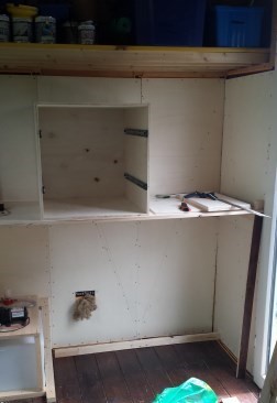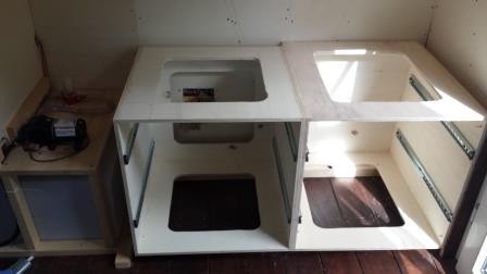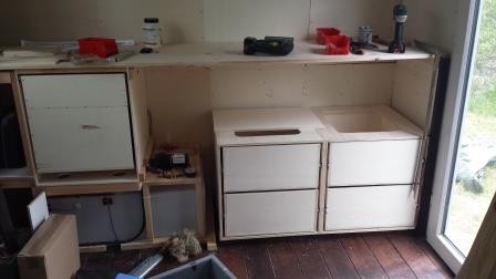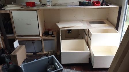 die Bücherregale hinkommen - vorzuziehen. Da sitzt ja schon der Wassertank und darüber eine große Schublade. Jetzt baue ich noch vier weitere große Schubladen dahin. Der Korpus ist aus