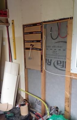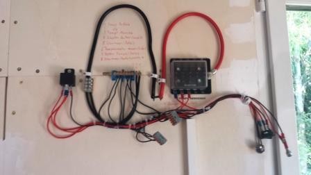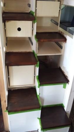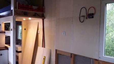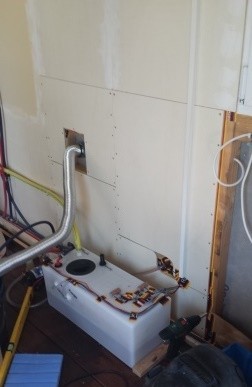 isoliert und mit Sperrholz verkleidet. Die gesamte Elektronik des Abwassertanks wird angebracht, getestet und ordentlich verdrahtet. In den Tank läuft der Inhalt von Tank 2, der in der Treppe