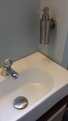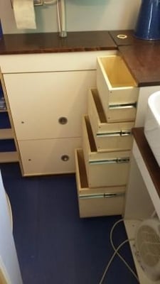 Auch im Bad geht es weiter. Im Schrank unter dem Fenster werden die vier Schubladen eingebaut und mit Fronten aus Multiplex Birke in Weiß verblendet. Ein Seifenspender kommt an die Wand am