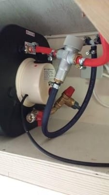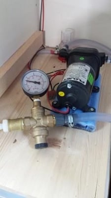 ganz dicht waren. Aber insgesamt war ich zufrieden. Weil der Boiler möglichst unter 1,8 Bar Eingangsdruck bleiben soll, habe ich direkt hinter der Wasserpumpe einen Druckminderer eingebaut. Der