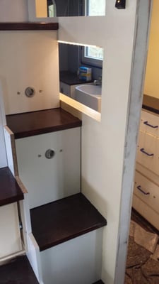 Die Treppe ist endlich fertig. Die Wände rechts und links in Hafer lackiert, die letzte Schubladenfront zugeschnitten und montiert. Auf dem Bild rechts ist der vordere Wandabschluss zu erkennen.