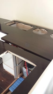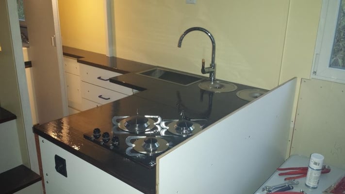 Die Endmontage der Arbeitsplatten stand an. Die Arbeitsplatten-Teile waren bereits drei mal mit Brillux Hochglanz Klarlack lackiert, jetzt erfolgte die Endmontage. Edelstahl-Spühle mit