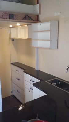 Jetzt konnte endlich an den Schränken weitergebaut werden. Der erste Oberschrank, mit Schiebetüren, rechts davon ein Gewürzregal, abgestimmt auf meine Gewürzgläser eines bekannten schwedischen