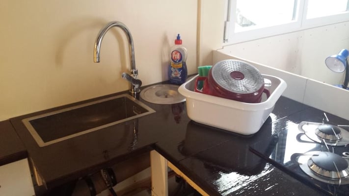 Abwasseranschluss, Armatur mit Kalt- und Heisswasseranschluss, die beiden Einbau-Abfallsammler aus Edelstahl und das Gaskochfeld aus schwarzem Glas. Was für ein Gefühl, das erste Mal das Wasser