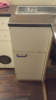 Möbelhauses. Der eingeschobene kleine Schrank unter der Spüle erhielt eine Tür, hier finden später Öl- und Essig und andere Flaschen ihren Platz. Unter dem Gaskocher sind jetzt zwei riesige