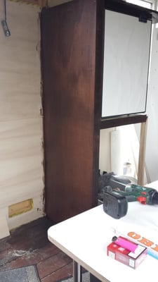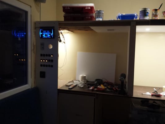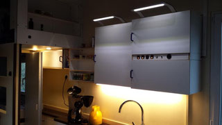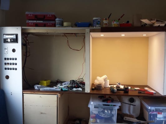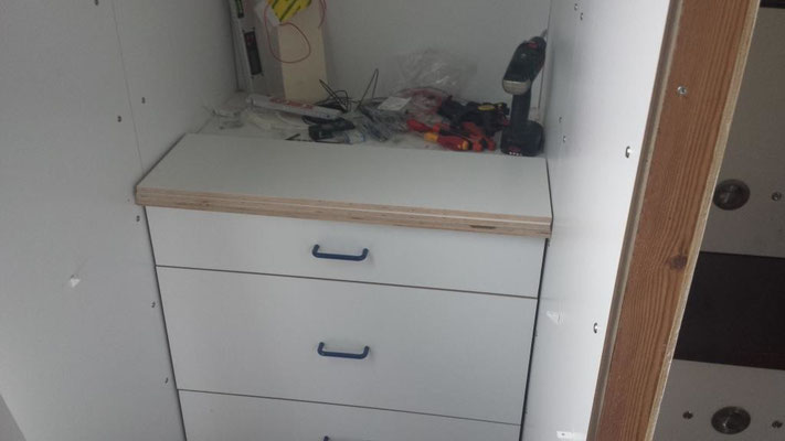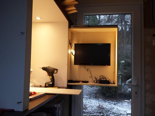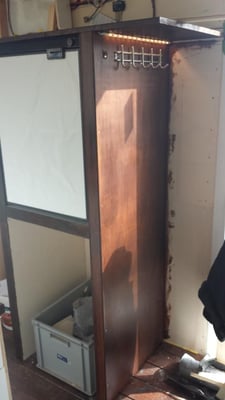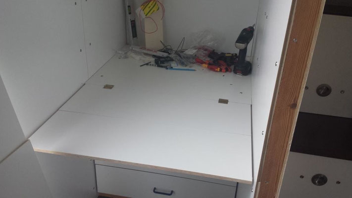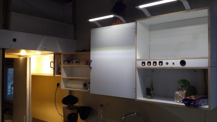 Dieser Bereich ist noch in Arbeit. Ganz rechts sitzt in einem Vollauszug ein kleiner Fernseher. Daneben das Fach mit den drei Leuchten gibt eine Vitrine für meine Flugzeugmodelle, links daneben das Fach bleibt offen als Ablage. Ganz links hinter der Blende sitzt ein Großteil der Elektroverteilung, Schalter dazu, die Wassertank-Füllstandsanzeige, ein Batterie-Computer (noch nicht eingebaut) und eine Truma Gas-Fernanzeige für die Zwei-Flaschen-Anlage sowie ein Autoradio. Oberhalb dieses Bereiches werden Bücherregale montiert. Auch die fertige Sitzbank ist hier auf dem mittleren Bild in der oberen Reihe zu sehen.