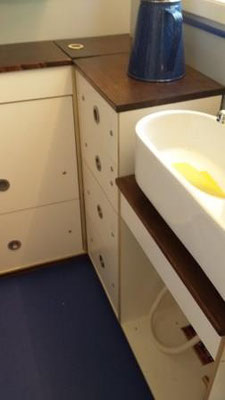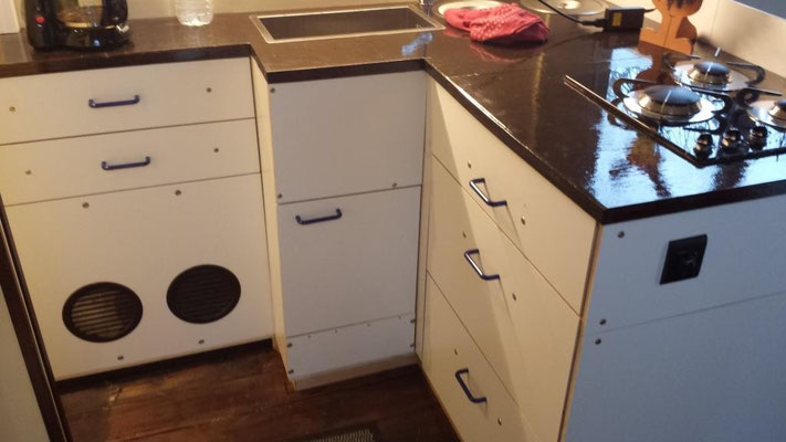 Die Küche mit einem dreiflammigen Gaskocher von CAN, kleines Edelstahl-Spülbecken und zwei Einbau-Abfallsammlern. Hinter den beiden runden Blenden sitzt die Truma E4000 Gasheizung. Der Schrank rechts daneben ist nur eingeschoben und kann komplett herausgenommen werden, um an die Technik heranzukommen.