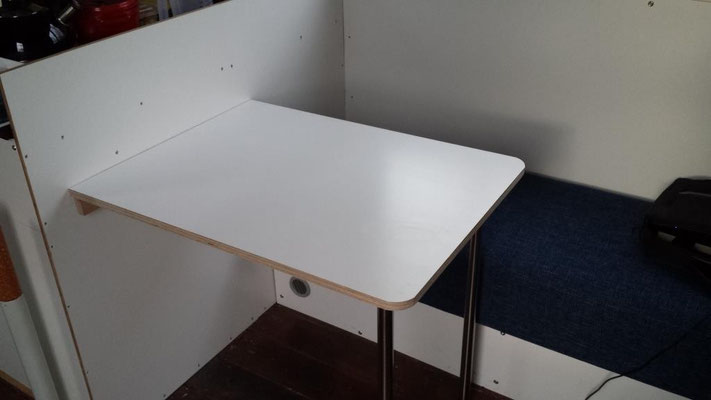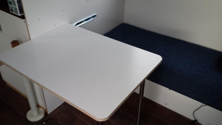 Die Sitzbank und der Tisch. Hier ist die Bank noch ohne Rückenlehne, die ist aber inzwischen auch drin. Eine Maßanfertigung eines Sattlers aus Weilburg. Saubere Arbeit. Der Tisch wird links auf einem Vollauszug geführt und ist damit bequem zu verschieben.