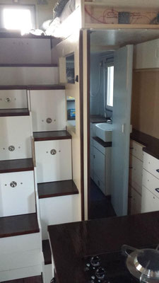 Die Treppe ist eine Raumspartreppe, versetzte Stufen, gewöhnungsbedürftig aber trotzdem angenehmer als eine Leiter. Die einzelnen Stufen sind soweit als möglich gleichzeitig als Schubladen ausgelegt. Die beiden Einzelbetten sind oben beiderseits der Treppe.