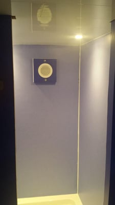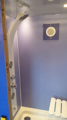 Duschtasse 80x80 cm, Ventilator in der Wand, um nach dem Duschen die Luftfeuchtigkeit nach draußen zu bekommen. Kompost-Toilette.
