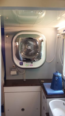 Das Bad. Ein kleines Waschbecken, an der Wand hängt eine 3 Kg Waschmaschine von Daewoo, Eckschränke.