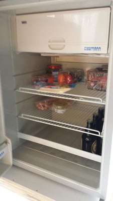 Der Kühlschrank sitzt gegenüber der Küche, weil ich großen Wert darauf legte, dass er in Augenhöhe sitzt. Es ist ein 12-Volt-Gerät von Kissmann in München, 120 Liter Inhalt mit TK-Fach. Energieverbrauch 14 Watt/Stunde! Der Bereich ist noch in Arbeit, links vom Kühlschrank wird später der Holzofen stehen, deswegen ist die Trennwand extra isoliert. Rechts vom Kühlschrank war noch Platz für eine kleine Garderobe.