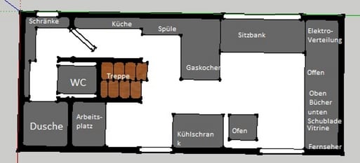 Links neben der Haustür ist ein bodentiefes Fenster, dort ist der Arbeitsplatz untergebracht, gleichzeitig bringt dieses Fenster Licht in die Küche. Auf der gegenüberliegenden Seite das große Fenster gehört zum Wohnbereich, das kleine Fenster ist das Bad. An der Stirnseite oben das kleine Fenster liegt zwischen den beiden Einzelbetten. Das Haus ist 5,80 Meter lang, 2,50 Meter breit und ab Oberkante Straße 3,90 Meter hoch (das Haus selbst hat 3,30 Meter Höhe).